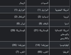 وفي المقابل، حققت ثلاثة منتخبات تقدماً مذهلاً في قائمة العشرة الأوائل، ويتعلق الأمر بكل من منتخب الأرجنتين وصيف البطل (3، +2)، وكازاخستان (5، +3)، وأوكرانيا صاحبة الميدالية البرونزية (9، +3)، والتي تخطت فرنسا (10، دون تغيير) بعد التغلب عليها في مباراة تحديد المركز الثالث.