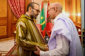 ولدى وصوله إلى القصر الملكي، استعرض فخامة السيد محمد ولد الشيخ الغزواني تشكيلة من الحرس الملكي التي أدت التحية، قبل أن يقدم له التمر والحليب جريا على التقاليد المغربية الأصيلة”.