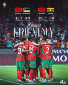 يستعد المنتخب الوطني المغربي لكرة القدم لخوض مباراتين وديتين خلال شهر نونبر المقبل بملعب طنجة الكبير، أمام منتخبي موزمبيق وأوغندا، ضمن برنامج تحضيراته لنهائيات كأس إفريقيا للأمم التي ستستضيفها المملكة المغربية ما بين 21 دجنبر 2025 و18 يناير 2026.