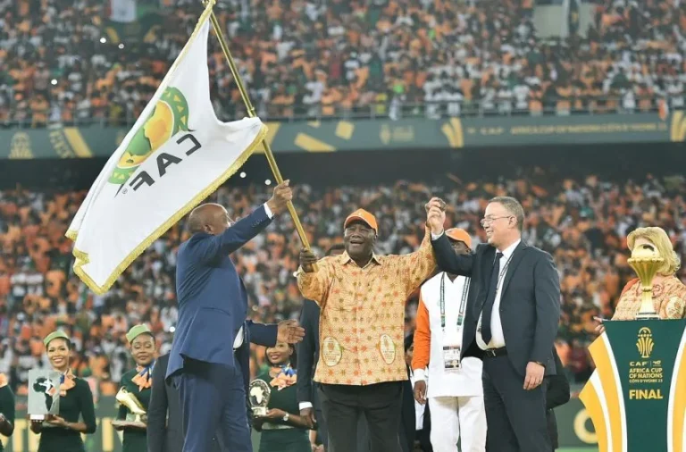 وجرت عملية تسليم علم الـ”كان” إلى السيد فوزي لقجع، عقب نهائي كأس إفريقيا للأمم (كوت ديفوار 2023)، الذي أقيم على ملعب الحسن واتارا الأولمبي بمدينة إيبيمبي شمال أبيدجان، بحضور رئيس الكونفدرالية الافريقية لكرة القدم (كاف)، السيد باتريس موتسيبي، ورئيس الاتحاد الدولي لكرة القدم (فيفا)، السيد جياني انفانتينو.
