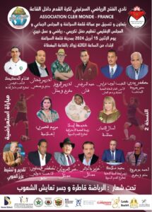 تحتضن مدينة قلعة السراغنة يوم الإثنين 15 أبريل 2024 حفلا كبيرا ينظمه نادي الفتح الرياضي السرغيني لكرة القدم داخل القاعة وجمعية كلير مون فوت من فرنسا بتنسيق وتعاون مع المجلس الجماعي وعمالة قلعة السراغنة والمجلس الإقليمي، تحت شعار ” الرياضة قاطرة وجسر تعايش الشعوب” وهو الحفل الذي يشرف عليه الفنان الشعبي الكبير حميد السرغيني والذي سيتولى تقديمه الإعلامي عزيز العبوبي.