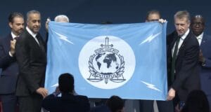 استلام المغرب لعلم الأنتربول إيذانا باحتضان الدورة الثالثة والتسعين للمنظمة الدولية للشرطة الجنائية أنتربول.